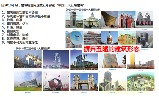 在建設(shè)改造過程中,還要防止“大、洋、怪”現(xiàn)象。自2010年起,某媒體連續(xù)五年評選“中國十大丑陋建筑”,其中有很多建筑使用功能極不合理,外觀抄襲嚴(yán)重,盲目崇洋、仿古等,這些都對于弘揚(yáng)民族文化起到了負(fù)面影響。