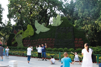 2015年是中國人民抗日戰爭暨世界反法西斯戰爭勝利70周年,北京市公園管理中心10日發布,市屬11家公園及中國園林博物館的花卉環境布置以“銘記歷史、緬懷先烈、珍愛和平、開創未來”為主題,將于本周開始在重點門區、景區、廣場和重要節點進行紀念活動花卉環境布置。共布置紀念抗戰勝利主題花壇32處,地栽花境100余處,預計用花總量280萬株(盆),展示時間為8月23日至9月初。
