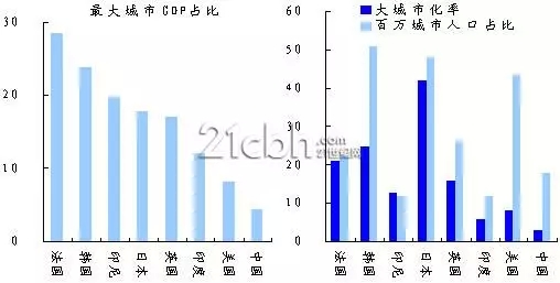 研究發(fā)達(dá)國家的經(jīng)濟(jì)格局,會發(fā)現(xiàn)幾乎所有的國家都沒有刻意采取區(qū)域平衡發(fā)展戰(zhàn)略,而是遵循人口自由流動的市場原則。其結(jié)果是區(qū)域經(jīng)濟(jì)發(fā)展極不平衡,但地區(qū)間的收入差距或整個社會的貧富差距卻縮小了。如巴黎的面積只占國土面積的2%,卻產(chǎn)生占法國28%的GDP;德國漢堡的人均和每平方公里GDP分別超出東北部落后地區(qū)的2倍和100倍,但兩個地區(qū)的福利卻沒有差異。即便像美國那樣土地肥沃而廣闊的國家,一半以上人口也只集中在五個州,80%的美國人口居住密度區(qū)的面積從1900年的占國土面積25%,降至如今的17%。更不用說與中國非常類似的兩個東亞發(fā)達(dá)國家日本和韓國,東京人口占全國城市人口的41%,GDP占日本的18%,也是全球GDP總額位居第一的城市;首爾人口占全國的25%,而GDP占24%(見圖)。因此,與這些發(fā)達(dá)國家相比,中國的經(jīng)濟(jì)集聚度、人口集聚度都比較低,區(qū)域經(jīng)濟(jì)發(fā)展的還是比較分散,如上海作為全國最大城市,GDP只占全國的4.4%。