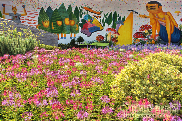 在上海園的檐下花園的彩葉植物展示區(qū)有一面長達(dá)30m的混凝土背景墻,如何讓傳統(tǒng)的混凝土再現(xiàn)光芒是設(shè)計(jì)方一直思考的重點(diǎn)。主要采取了以下策略:(1)采用網(wǎng)架搭建技術(shù)構(gòu)筑雙曲面墻來柔化混凝土質(zhì)感。(2)采用絢麗彩色涂鴉彌補(bǔ)混凝土的冰冷,增添趣味性和互動(dòng)性。