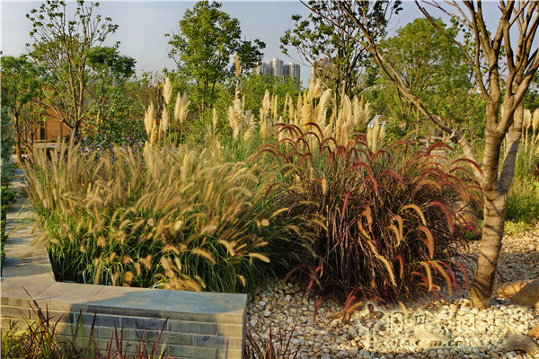 (1)觀賞植物:觀賞植物主要布置在主入口處第一個花園觀賞花園。主要選用觀賞特性出眾的特色多肉類植物和觀賞草類植物,該兩類植物為屋頂綠化中常用植物品種。主要植物品種有:墨西哥鼠尾草、小兔子狼尾草、藍冰麥、粉花隨意草等。