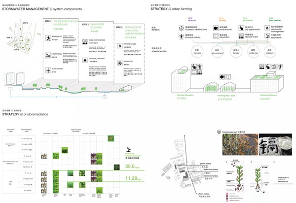 整合了雨水管理、棕地植物凈化和都市農(nóng)業(yè)的生態(tài)策略作為整個公共空間再造的驅(qū)動力之一,在不同高度和層次上展開。廠區(qū)內(nèi)地勢平坦,方案因而從高程分析出發(fā),在排水不利的高洪澇風(fēng)險區(qū)引入以生物廊道相連的雨洪花園和下滲地面,減少短歷時強(qiáng)降雨的雨水外排量而降低對市政排水系統(tǒng)造成的壓力,從而整體實(shí)現(xiàn)低影響開發(fā)。同時,這個連貫一體的雨水管理系統(tǒng)可以收集并凈化雨水以供植物灌溉所用。
