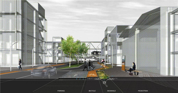此外,為提供更為步行友善的街景環(huán)境,貫穿場(chǎng)地南北四車(chē)道的主路被轉(zhuǎn)化為雙車(chē)道的慢速軸線(xiàn)。蜿蜒的車(chē)道與步行鋪地、自行車(chē)道、停車(chē)、生物廊道交織在一起, 形成更為豐富有活力的步行體驗(yàn)街區(qū)。