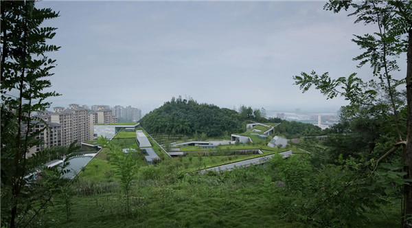 該社區(qū)中心位于重慶桃源公園的山上。設計的出發(fā)點在于將新建建筑的輪廓與高低起伏的地勢融合起來。與其在上山建造一個“物體”,設計師更希望將建筑與山地融為一體。綠色的屋頂和墻面能讓建筑融入周圍的自然環(huán)境中,并且提高建筑表面的熱效應。