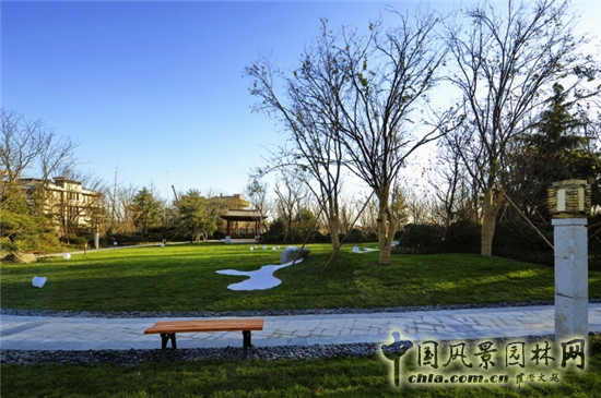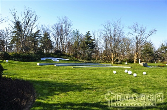 外圍道路人車分流,雙向四車道的寬闊路面,兩側植物掩映中自然式蜿蜒人行步道。車行道路兩側堆造自然形態坡地,植物種植結合坡地景觀,以樹形優美,胸徑40cm,冠幅5米左右的實生銀杏作為行道樹,車行道路兩側堆造自然形態坡地。