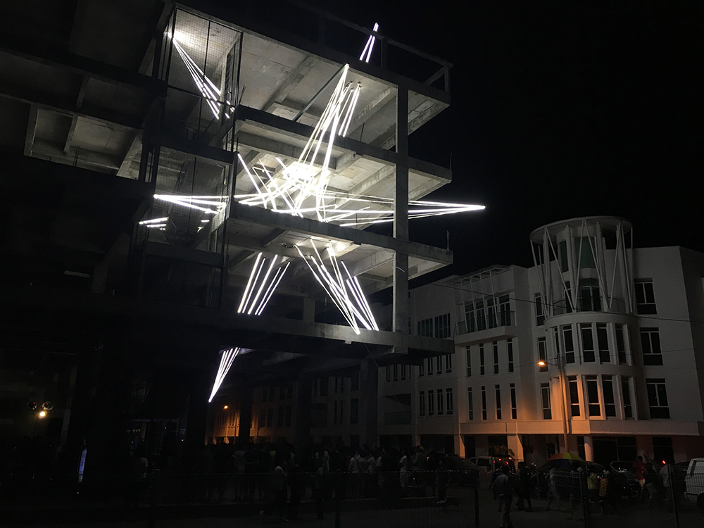 這件作品由500英尺長的鋼索及LED燈帶組成,向著12個方向延展。
