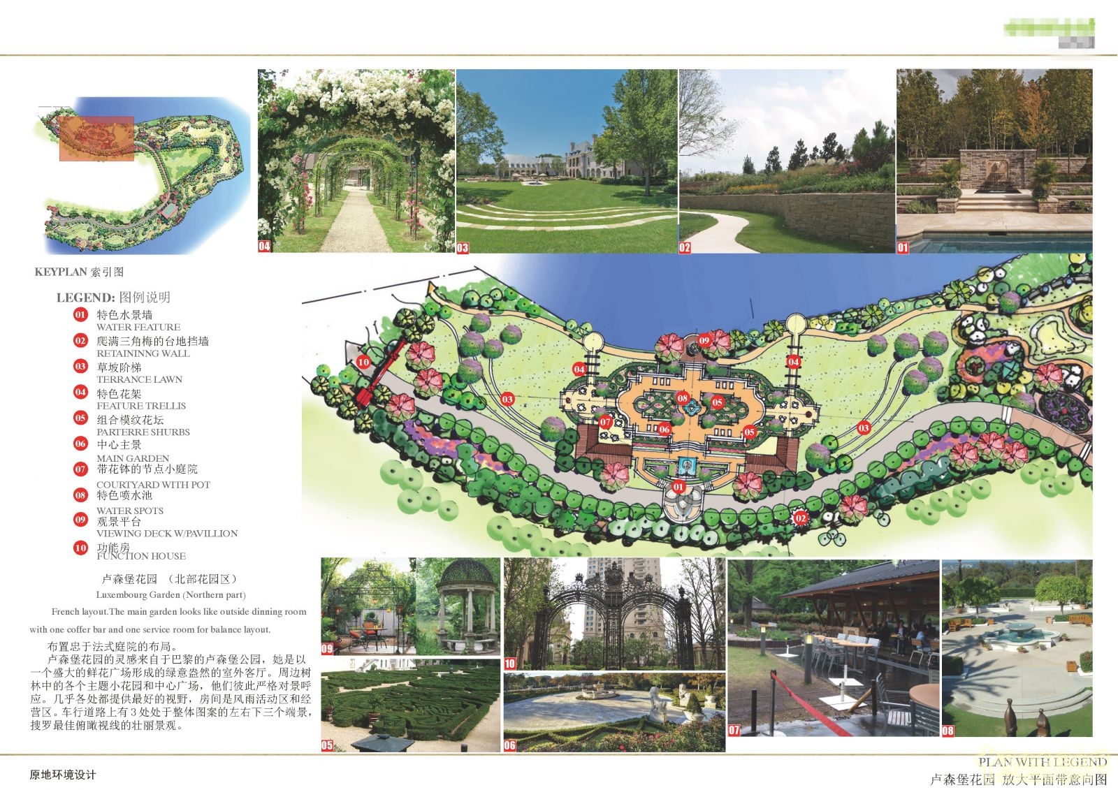 布置忠于法式庭院的布局。盧森堡花園的靈感都來自于巴黎的盧森堡公園,它是以一個盛大的鮮花廣場形成的綠意盎然的室外客廳。周邊樹林中的各個主題小花園和中心廣場,他們彼此嚴格對景呼應。幾乎各處都提供最好的視野,房間是風雨活動區和經營區。車行道路上有3處處于整體圖案的左右下三個端景,搜羅最佳俯瞰視線的壯麗景觀。