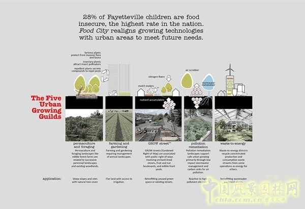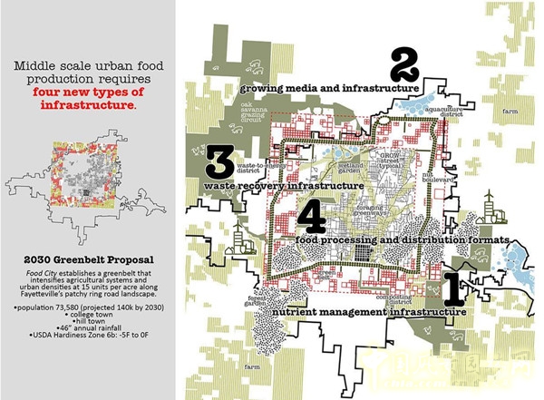 28%的費耶特維爾兒童都面臨著不安全食品的威脅,這一比例為全國之首。因此,食品城市的規劃期望在城市空間中打破原有的糧食種植技術,以適應未來城市的需求。