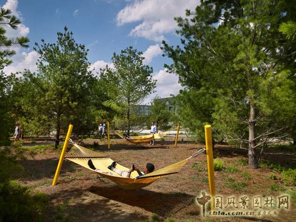 場地將活躍的娛樂游戲與安靜的聚會場所做到了很好的平衡。例如,X型的長桌用于野餐和會議;附近黃色的吊床和樹木形成安靜的休息空間。