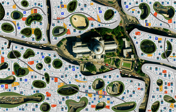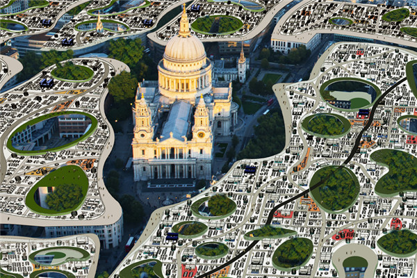設(shè)計者認為,既然科技已經(jīng)解放了人類與商業(yè),并使真實機動性成為可能,那么本次提出的這一設(shè)想也并不是難以想象,希望借此解決人口密集城市固有的通勤時間過長的問題。這種新型的工作場所是位于城市所有建筑物上方的單層開敞辦公空間。正是得益于這種水平向的空間修剪,這一方案能夠滿足整個城市工作場所的空間需求:需要光線與開闊視野的區(qū)域處將開啟相應(yīng)的環(huán)狀天井,這樣一來,從高處公共場所也能夠俯瞰倫敦城的景色,同時還能充分享受陽光。有了這種滲透整個城市的流動性工作方式,人們再也不必占用同事辦公桌,還可以把車停在任何自己想要的地方。