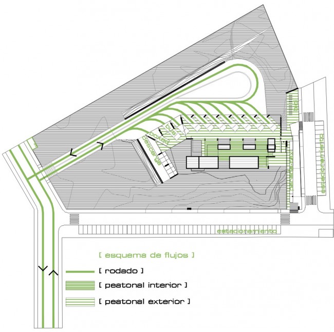 車站內有兩個不同的層區,巴士停泊區和乘客活動區。公交車在地平層進出,與乘客的動線幾乎沒有交叉。乘客的入口位于靠近城市的更高平面上。建筑師通過石子鋪面來引導層高不同的兩支流線。只要進入到“巨石”覆蓋的區域,人們便很容易進入到站內。