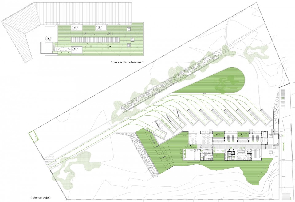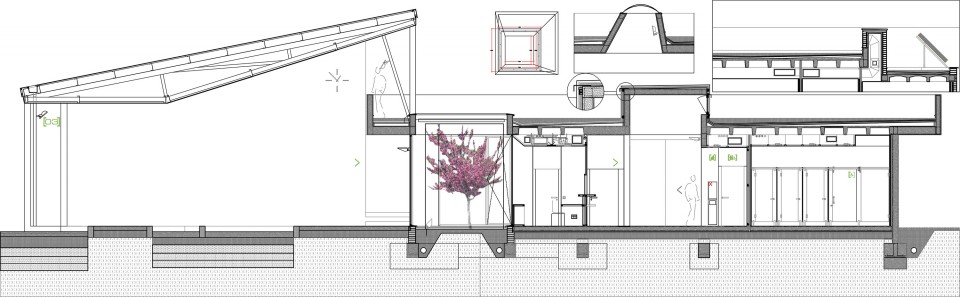 混凝土地面、墻面和天花,再加上整體性極強的建筑外觀共同界定了乘客的流動空間,空間中穿插著各種功能房間。玻璃墻面分隔出不同的區域和密閉的庭院,營造出一種通常會在自然界的石縫間發現的光感和通透感。