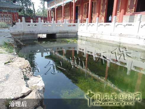 項目面積為1260㎡,四面環水,有橋可通。景觀水體渾濁、發綠、伴有藍綠藻爆發,水體表面漂有青苔、黑苔,水體景觀效果很差,水質為劣五類水。通過愛爾斯水域生態構建技術系統治理后,從根本上解決景觀水體的富營養化問題,水質達到地表Ⅲ類水標準。