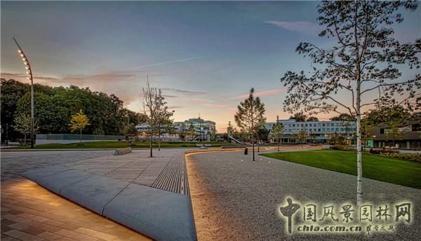 廣場中樹木的排布很容易讓人產生一種錯覺,那便是樹木仿佛都是從西側的小樹林中“逃離”而出,繼而零星分布于廣場各處。在原有的植被基礎上,改造后的廣場又新增了不少全新的樹種,包括夏櫟、皂莢樹、白樺樹、黑松等。