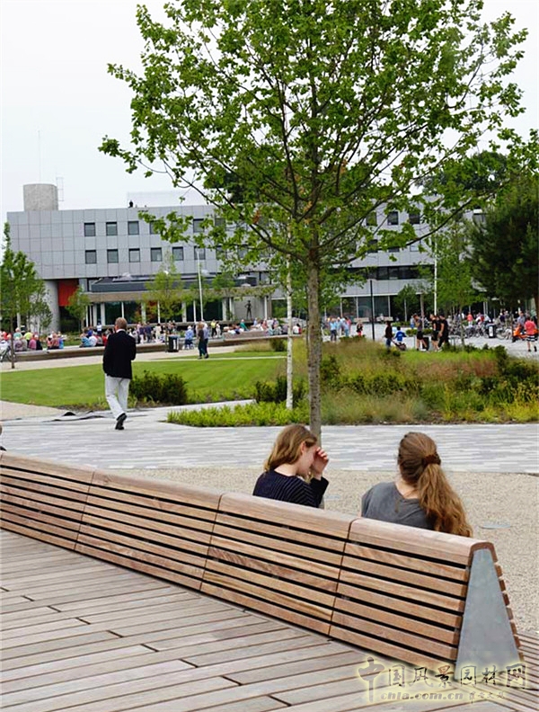 極易辨識的日光休息區(qū)與水景區(qū)共同組成了廣場中最具吸引力的景觀。休息區(qū)由普通的木質(zhì)長椅逐漸延伸,變成了流動(dòng)的木甲板,在廣場中央為市民提供了充足的享受日光的空間。