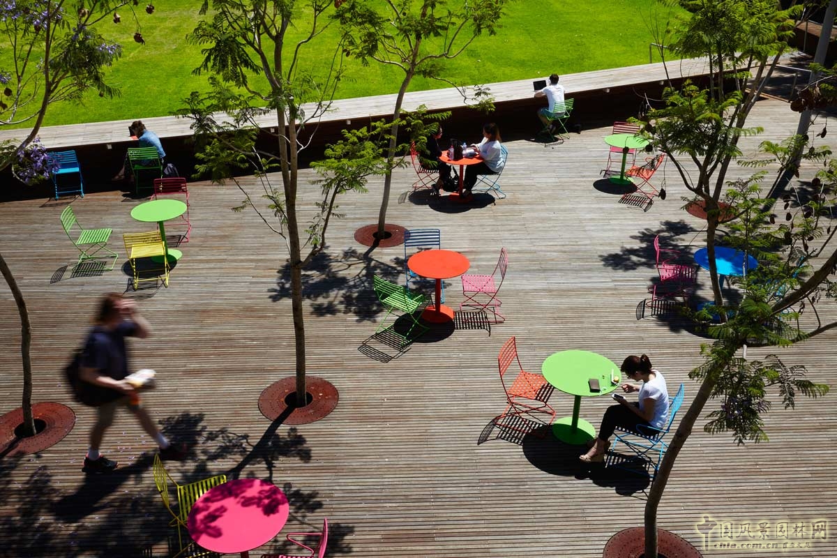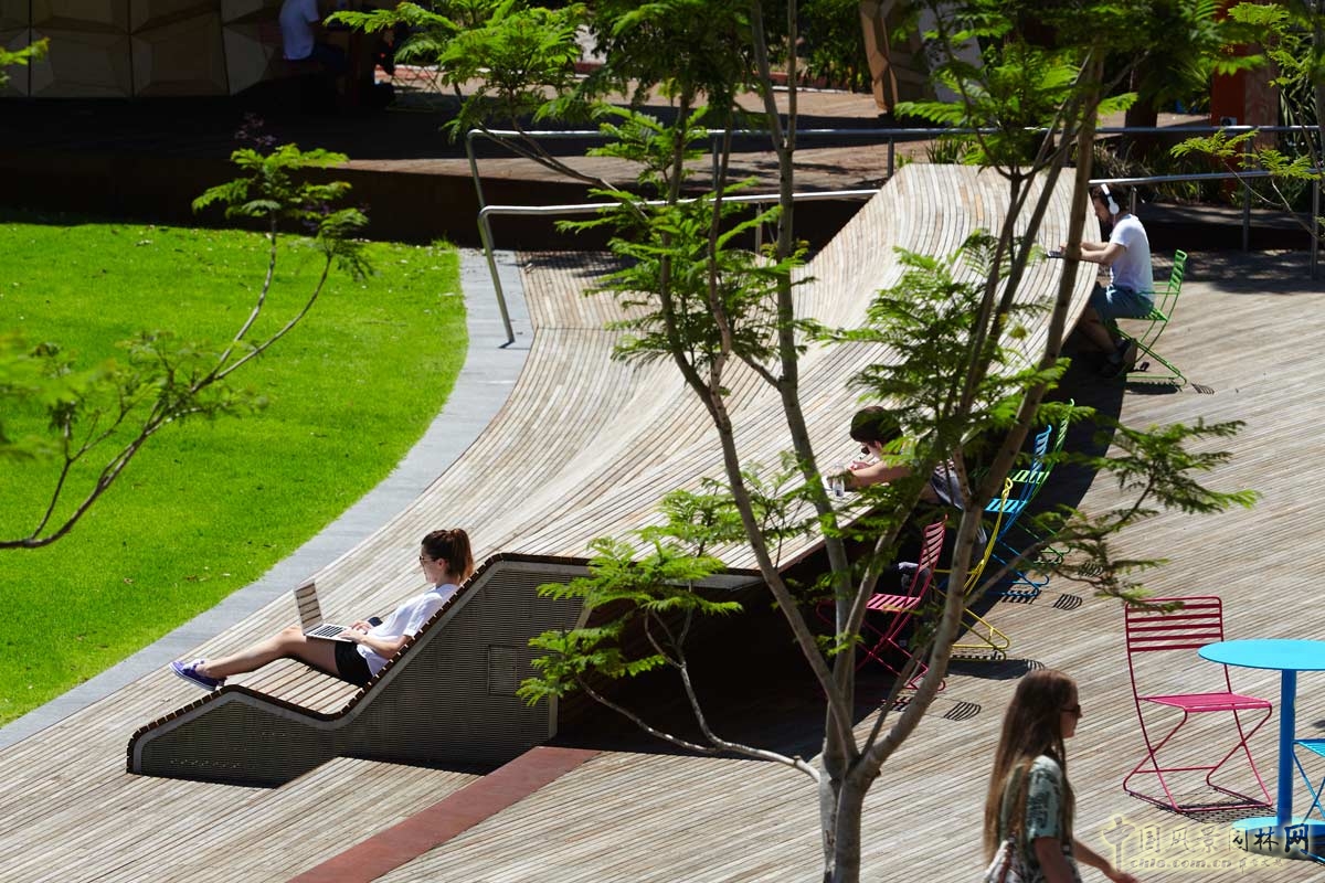 TCL事務所設計的草坪以及人行步道是現在校園內的核心景觀。一個稍稍下沉的草坪作為全年活動的平臺,同時也作為校園外繁忙的道路系統的裝飾。典雅的甲板露臺上配有咖啡桌和椅子,供久居室內的人們放松身心,呼吸一下新鮮的空間。甲板露臺上擺放有藍花楹樹,提供斑駁樹蔭的同時,也作為該校園的特色。藝術創作者Agatha Gothe Snape還在校園中設計了一個藝術作品,風格很好的融入了校園的整體構思。