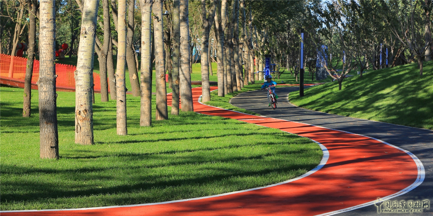 通過對人居習慣的科學數據分析,設計師將原規劃中的4米電瓶車道拆分為2.5米車道和1.5跑步道。這種道路拆分是順應城市發展和宜居習慣變化的改變,與此同時,通過設計將道路的功能分區有機融合,依據地緣特點使之呈現出柔緩靈性的景觀效果,增加了居者的游玩體驗性?;跇I主多功能性的需求考量,沿途安置的休息空間和健身器械也是經過實地測試和數據分析后得出的合理布點。