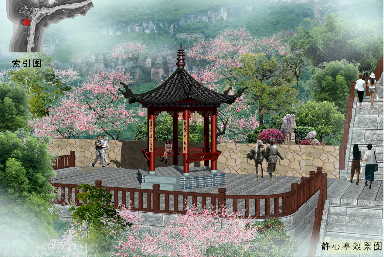 隨著棧道的延生,走到曲徑通幽的地方總會覺得世界都很安靜。靜心亭便是一個能讓人心靜的棧道景觀節點。走累了還可在亭子里小憩一下。