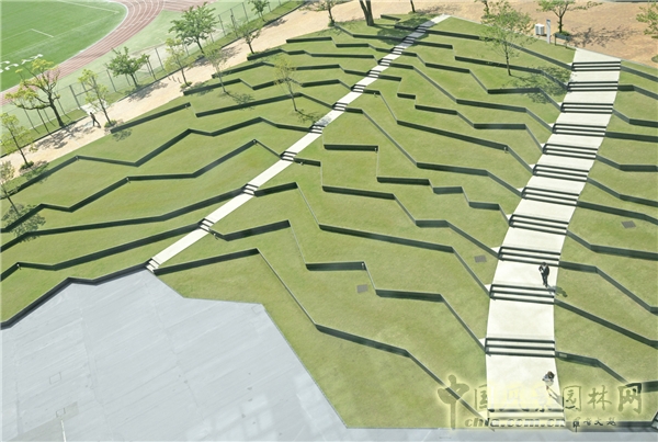 委托人不希望在這里加入太多的設(shè)計,于是設(shè)計師利用一個奇妙的想法,在原有的斜坡上,運用美麗的不規(guī)則線條設(shè)計了梯田景觀。場地被樹木的陰影覆蓋著,一條道路被設(shè)置為彎曲的折線,通往最下面的足球場。讓人們無論在那個視角都能感受到令人驚嘆的景觀。