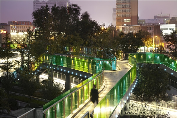 在整個項目的構思中,設計師把項目的綠地空間打造成為濟南市的城市聚會空間,讓不同年齡段的所有人群都能找到屬于自己的活動空間,公園部分大膽采用了臺地的形式,最高處是一個抬高3 米的草坡地形,形成一個戶外舞臺看臺,可以同時容納上千名市民觀看周末星空電影。公園形成了漫步道、觀景平臺、聚會小花園等多個不同尺度的空間讓市民活動。