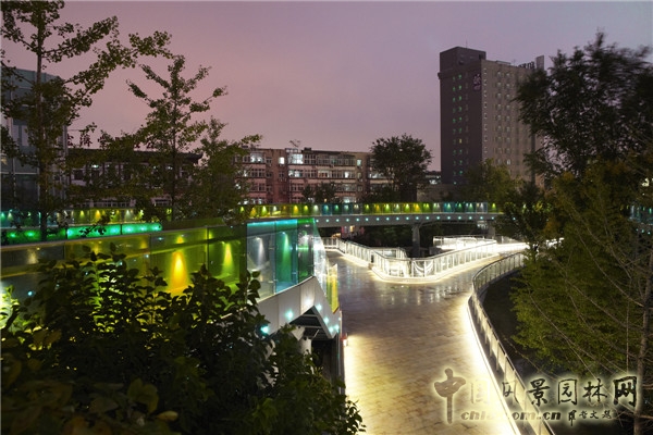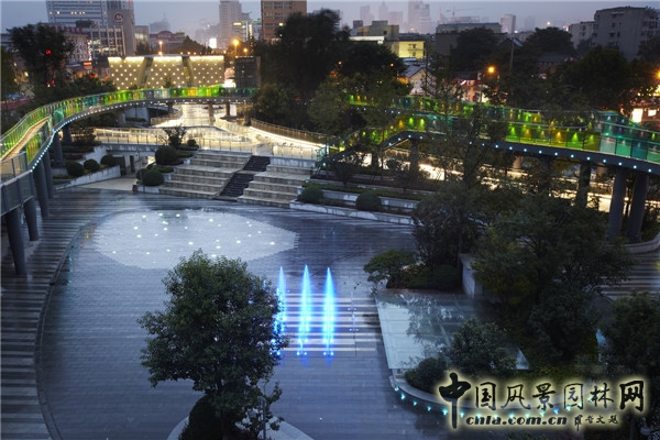 設(shè)計(jì)師大膽地將公園的地形梳理慢慢抬起,連接上一條6 米高,300 米長的景觀廊橋,將散落的建筑單體聯(lián)系到一起,打破了空間上的局限性,將各個(gè)商業(yè)建筑串聯(lián)起來,并形成了一個(gè)商業(yè)內(nèi)庭廣場,供游人休憩及商家組織活動(dòng)。