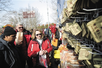 13日,朝陽公園“洋廟會”上,一些具有中國特色的工藝品吸引外國游客光顧。
