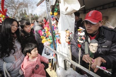 13日,朝陽公園內,面人攤位前圍滿游客。