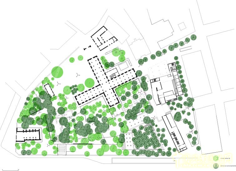 中國風景園林網訊 這個項目是對西班牙一座醫院花園的改造,旨在通過設計建造,將整個花園的景觀風格統一起來。項目位于的地方,之前坐落著一個結構復雜的建筑物,1974年被拆除,但濃厚的歷史韻味卻遺留下來,讓人仿佛回到了15世紀的早期階段。在1974年的拆遷過程中,只有古老的看護院中的教堂十字型翼部、Capitulet和Santa Lucia(十六世到十八世)小教堂幸存了下來,它們與醫院的入口緊密相連。