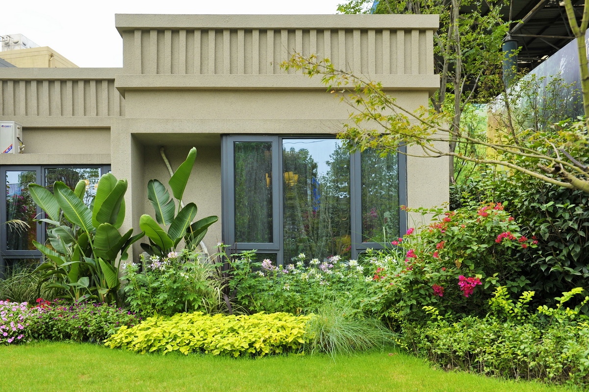 3、樣板房小徑:喬木使用了黃連木枝條優美,柔化建筑,在視線的拐角處栽植樹形飄逸的青楓,在節點位置使用地籠桂花和元寶楓,及不堵也不散。搭配出的花卉層次分明,色彩豐富,清新自然增加了小徑的美感。