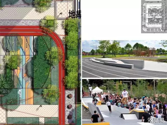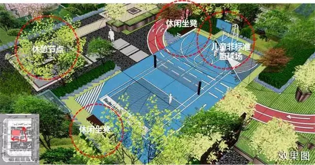 其中兒童復合型運動場地考慮到孩子好動的天性,將地面色彩鋪陳的極為強烈,具有沖擊感,創造出不同的功能用途和空間,用于兒童打籃球、羽毛球等活動,并且在場地內設置了家長看護的坐凳和休憩節點。