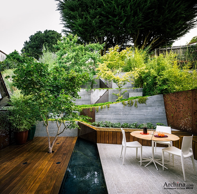 這個花園旨在拓展業主的戶外生活空間。業主的院子有一個陡峭的坡,坡上坡下各有一塊平坦的用地可作為休息場所。為了避免占用過多的庭院面積,采用了高臺地式布局,上面種上了日本楓樹和芳香植物。業主希望將室外座椅區和娛樂區布置在靠近房屋的位置。