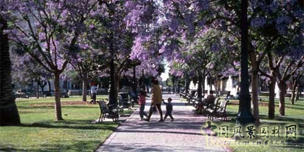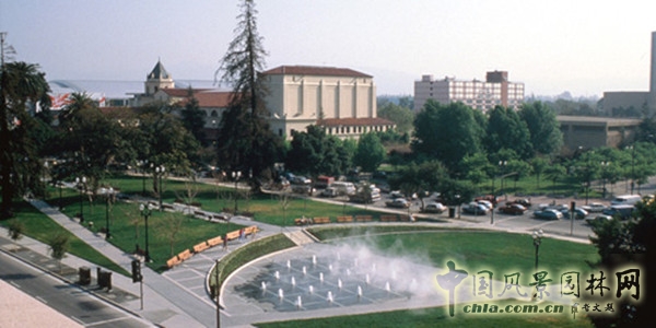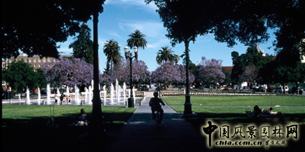 廣場公園是位于圣·何塞市市中心,始建于1986-1989年,設計工作由哈格里夫斯負責。該公園集休閑娛樂功能和慶典集會功能于一體,周邊有藝術博物館、旅館、會議中心和商務辦公樓。哈格里夫斯通過疊加的手法,將一個新公園覆蓋在原來的老公園上,保留了場地上所有成熟的樹木,運用各種隱喻的手法,使用地域性的,具有文化歷史內涵的語言,使這個公園以一種地域性的風格來滿足城市生活的需要。