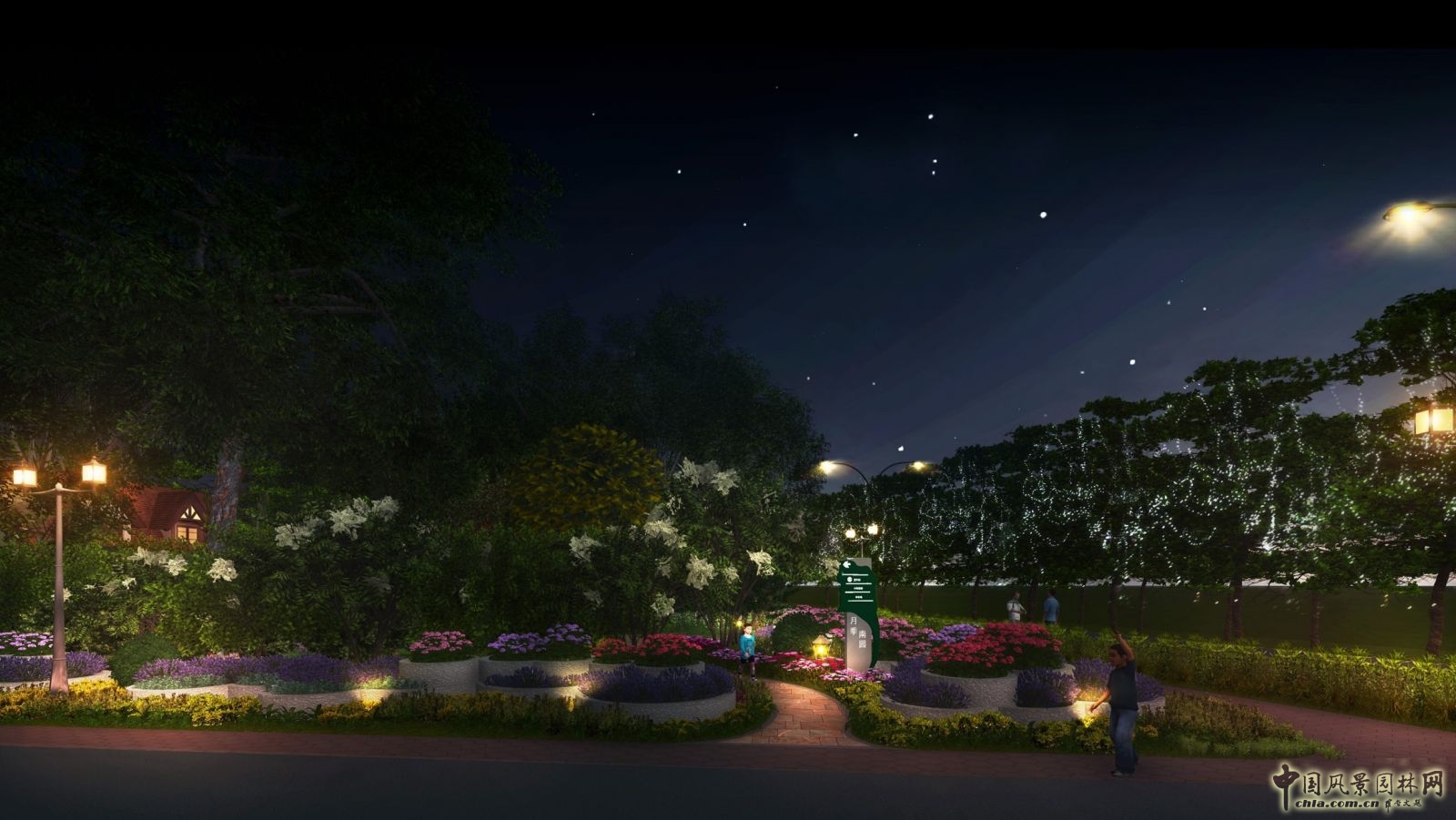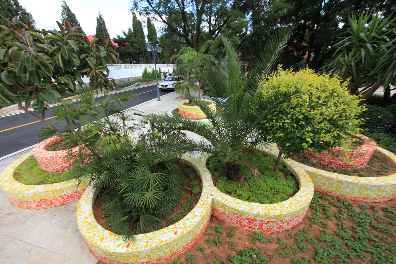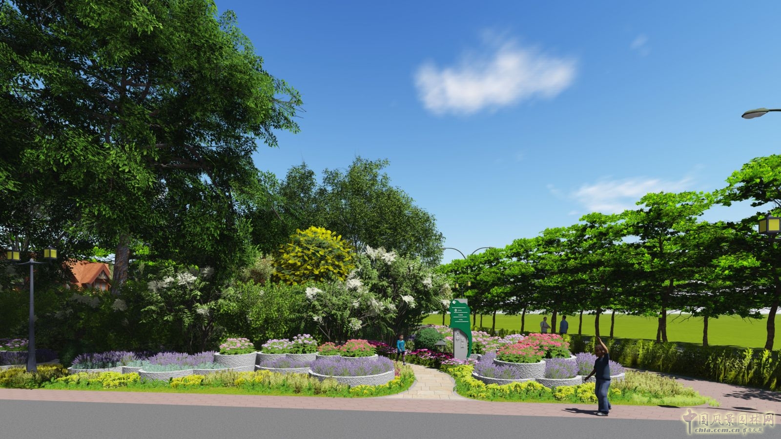 提升月季園南園——提取月季花形,增加彩色瓷片花壇,增強路口標志性和道路特色。