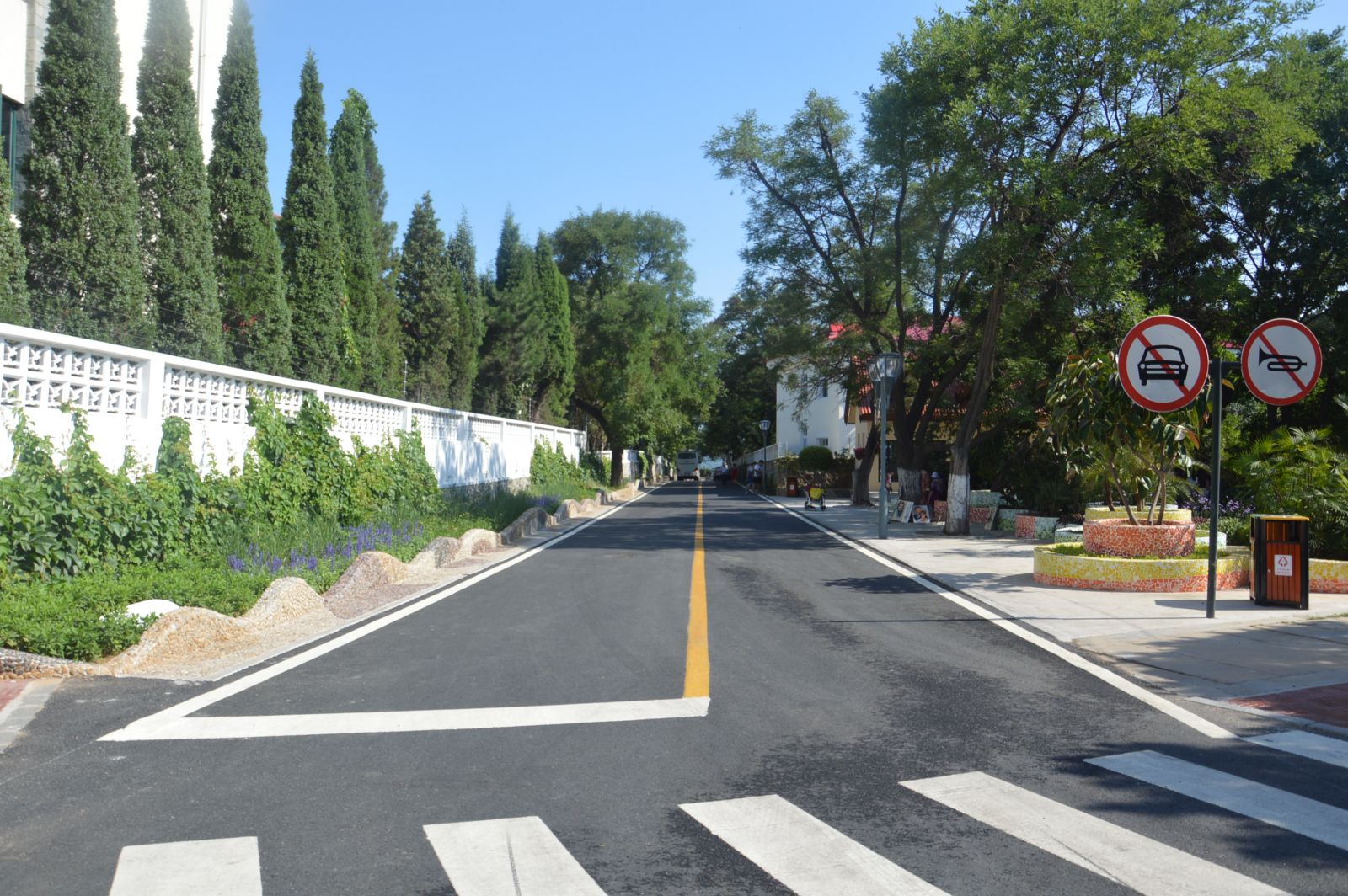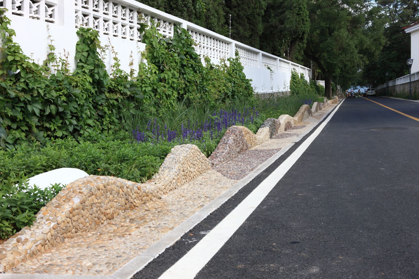 去掉排水明溝,新辟綠地——以白色、米色、褐色3色卵石為元素,作波浪形花池壁和人行道,形成道路特色。