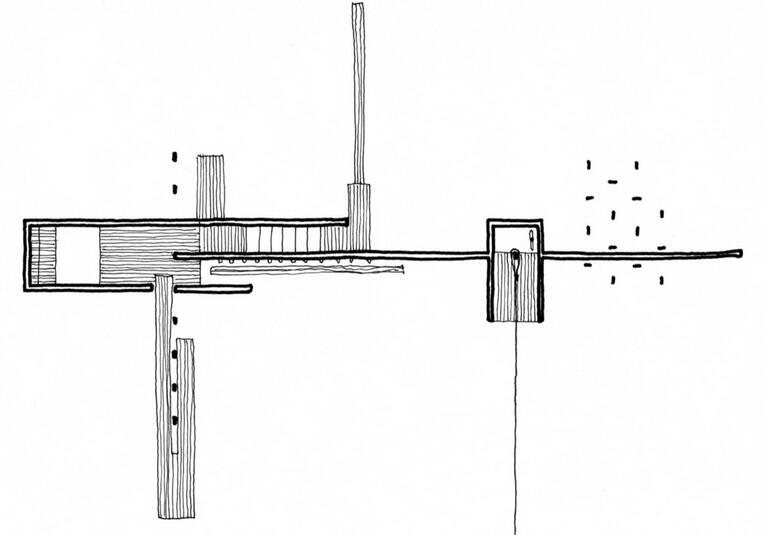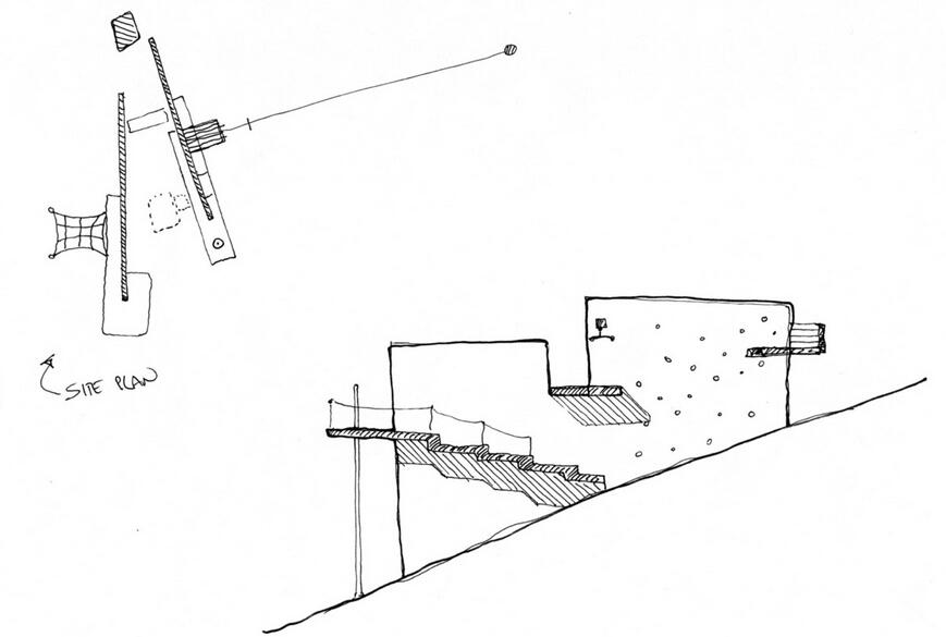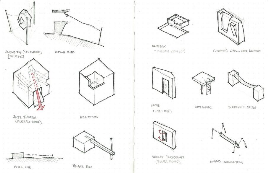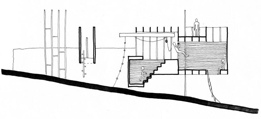在這個項目中,設計師門致力發揮創造力給使用的兒童留下足夠的想象空間,抵制過于表面純粹的文化符號。設計中垂直于地面豎向直立的一些二十英尺高的木柱支撐起了整個設施,同時與周圍挺立的樹木組合成了一副和諧的景觀場景,滿足了從功能到審美的共同需求。設施周圍并沒有明顯的指示標明出入口位置,而是采用在其表面繪制一些彩色的條紋和圖形的方法作為提示標志。這個設施如同常規建筑一樣設置了門和樓梯的位置,但功能上卻與平日完全不同,譬如一個貌似為門檻的裝飾卻被懸浮安置在單獨的墻壁一側。這樣的設計使得整個設施在使用中變得更加的靈活,并不拘泥于常規,同時也給孩子們帶來了更大的挑戰和趣味性。