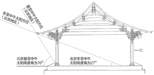 屋檐要大?舒適的屋子自然是要冬暖夏涼。以北京地區為例,北京地區的太陽高度角夏季為76°,冬季為27°,假如據此設計屋檐的尺度——“柱高一丈,出檐三尺”, 或采用柱高的1/3的慣用做法,把屋頂脊部做成陡坡,而把飛檐做成緩坡,形成圓和的曲線,恰好使冬至前后陽光滿室,夏至前后屋檐遮蔭。