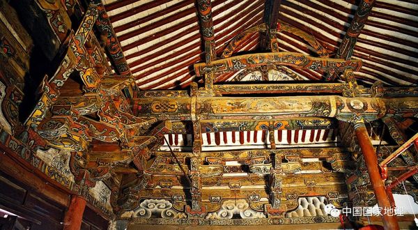 上圖拍攝于山西陵川小會嶺二仙廟。大殿內滿布清代的彩繪,梁架下半部分為北宋的原物,上半部分則為明、清重修所替換。兩個時代的梁柱相互疊壓,像是匠人們跨越時空的對話。攝影/趙鋼