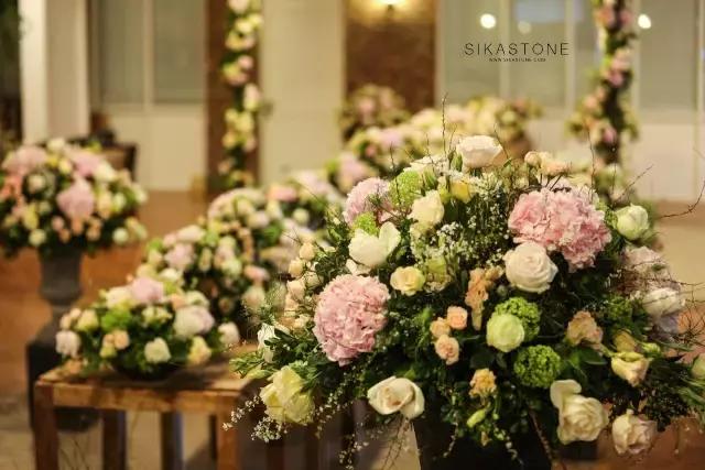 這是一場偏向巴洛克風格的經典婚禮花藝設計:花材豐富,體態豐盈,色彩明麗。整體給人以浪漫,甜美,典雅的感受。