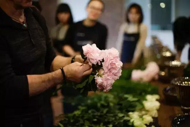 在添加花材的過程中,以質地緊密的粉色繡球和色彩輕盈的白色玫瑰為主。淡綠色的木繡球進一步豐滿了作品,并使得整體色彩更加柔和。