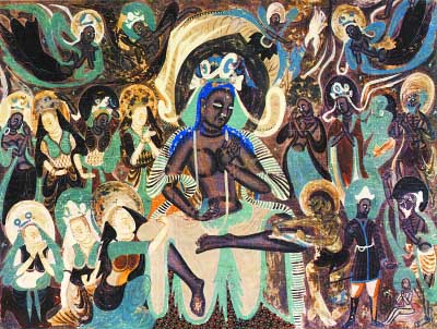 20世紀40年代初,一些美術家開始造訪莫高窟,其中最早的是河南人李丁隴,但引起人們注意的還是張大千的敦煌之行。1941年,張大千帶人前往敦煌,在莫高窟住了一年多,他先是用自制的透明紙蒙在壁畫上過稿,再拷貝到宣紙上描線涂色,一年多下來,臨摹了200余幅。在蘭州、成都、重慶連續舉辦臨本展時,參觀者眾多,并引起了文化界和政界的注意。雖然張大千的臨本有些地方根據自己的愛好進行了改動,有些色彩不夠準確,渲染層次也不夠,但總體上反映了敦煌壁畫的框架結構,線描也很流暢,效果還是不錯的。