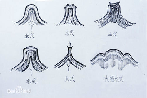 關于五行山墻有這樣的話:金者頭圓而足闊,木者頭圓而身直,水者頭平而生泥,平行則如生蛇過水,火者頭尖而足闊,土者頭平而體秀。