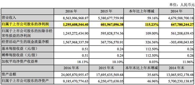 報告期內,公司實現營業收入85.64億元,同比上升59.16%;實現歸屬于上市公司股東的凈利潤12.96億元,同比上升115.23%。