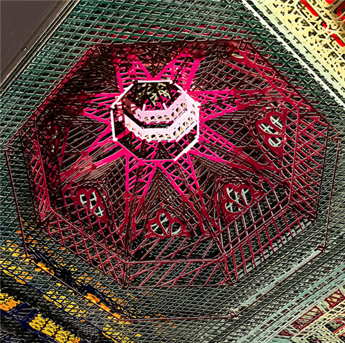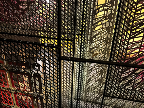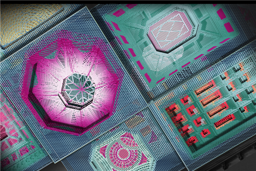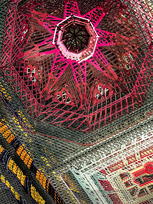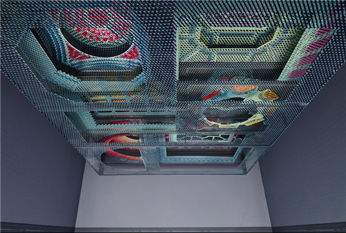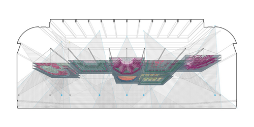 多數的天花板都通過界定房間上界的方式來作為庇護功能的暗示,視差裂縫卻相反,將空間感受延續到其邊界之外。裝置拉出了一系列的天花板,使其突出至畫廊邊界之外,描繪出一系列著名的19世紀與Renwick的建造同期進行的美國室內設計。懸掛的垂幕延續了FreelandBuck一貫的興趣追求,用21世紀的先進科技和視覺文化將三維繪畫應用于整個建筑尺度。