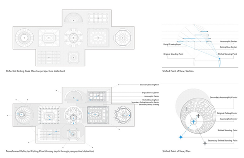 大沙龍相對高度較低而水平的寬敞空間并不適合一點透視的視錯覺,而是需要將一系列的場景在畫廊中展開。裝置中9組天花板中的每一組都繪有基于多個不同定視點的透視,除此之外的視點所觀察到的是扭曲、扁平、比例失調的體量。這樣,游客行于畫廊中,畫面看起來如同在不斷消逝、碰撞與分解。