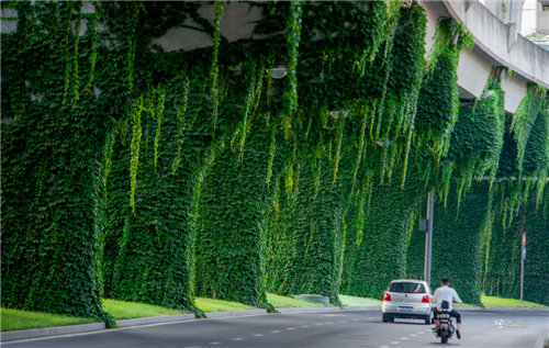 建成于2013的的成都二環路高架橋,全長28公里,是城市快速公交BRT,每天30萬人次的搭乘。橋下是巨大高的橋墩,采用了一種攀附力強的植物“爬山虎”。不過幾年時間,寓意盎然的“爬山虎”已經長滿橋墩,讓整個二環路擁有了與這座城市相吻合的文藝氣息。