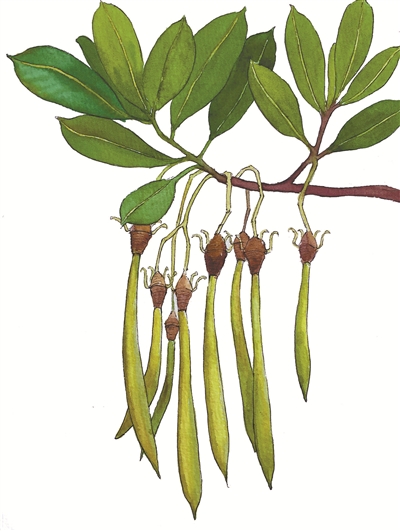 秋茄樹是比較有代表性的紅樹林植物之一,主要表現在它的“胎生苗”特點上。其果實還掛在母樹上時,種子已長出胚根,繼續吸取足夠的鹽分以適應新環境。胚軸成熟后即脫離母株掉落于淤泥中,成為新的幼苗繼續成長。