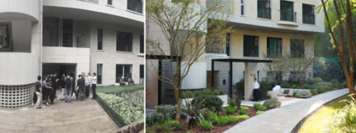 項(xiàng)目位于城市最核心、建設(shè)最密集的區(qū)域,這是對高品質(zhì)居住環(huán)境空間改造的任務(wù)。項(xiàng)目擁有俯覽城市的視野、背靠鵝嶺公園的生態(tài)綠地、著名建筑師完成的個性十足的居住建筑等等,眾多因素都成為我們?yōu)橹d奮和思考的源頭,但工作開展又困難重重。室外已建現(xiàn)狀讓優(yōu)質(zhì)資源減弱,主要表現(xiàn)在超荷載的豎向關(guān)系、模糊的交通體系、粗放的功能還有建筑與景觀的脫離。而面對困難,我們對環(huán)境進(jìn)行了“適度拆除和空間重構(gòu)”。