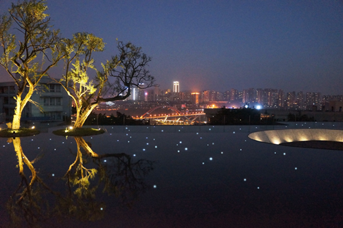 室外空間并不富余,但室外最美的景觀就是把城市的美景盡收眼里,大有一覽眾山小的氣勢。我們想把這樣的景色深刻的留在人們的感觀當(dāng)中,舒適的空間又能讓人停下腳步。我們用一條安靜的水帶勾勒了空間邊界,它又是連接不同豎向臺地的要素。水帶在視野最佳的地方匯聚開來。此刻,它就像一面鏡子,把天空、城市和環(huán)境倒影在一起。很安靜,讓人充滿想象。
