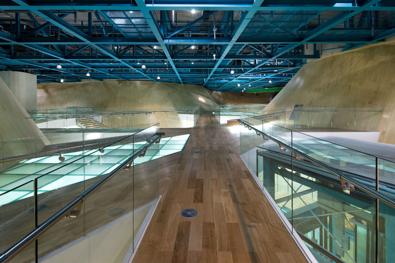 這是一個特別的建筑,里面有著不同一般的建筑空間,建筑內部的通道和空間設計多是流線型。作為一個展覽空間,展覽和表演空間可以容納400人,平展的天花板是必要的。