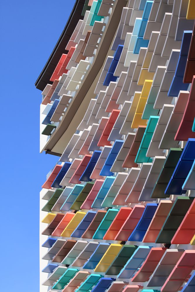 度假村的每個(gè)公寓單元通過一個(gè)馬蹄鐵形彎曲的走廊連接。這種類型的走廊由于人工照明和通風(fēng)不良,經(jīng)常會產(chǎn)生不良的環(huán)境。出于這個(gè)原因,選擇了一種“陽臺通道”式走廊,它更能提供自然光和相當(dāng)充足的通風(fēng)。曲線走廊也提供了一種更舒適的感覺。